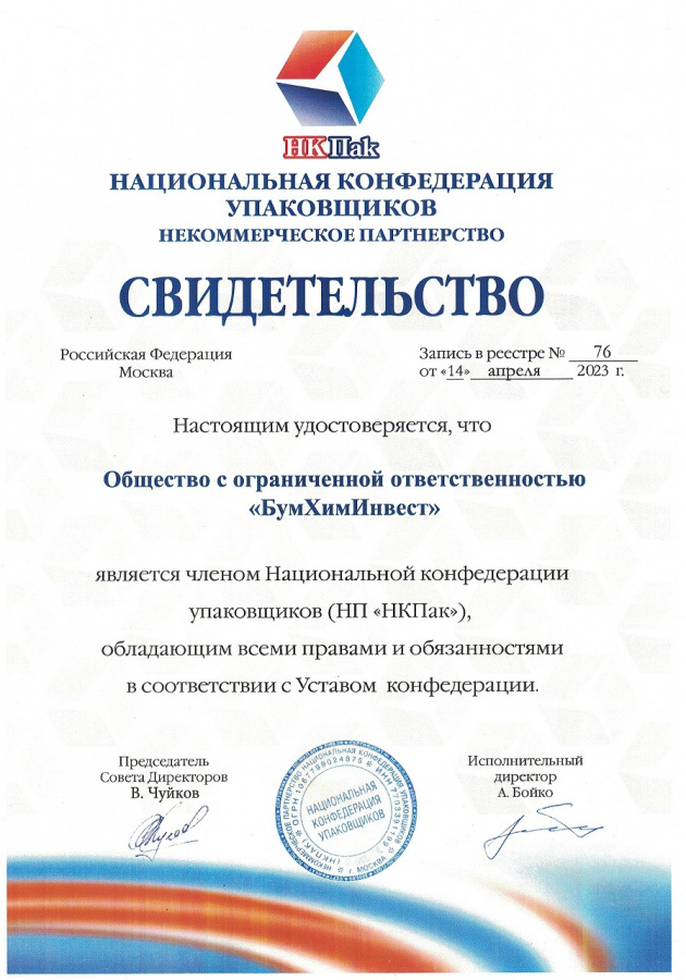 ООО "БумХимИнвест" является членом Национальной конфедерации упаковщиков НП "НКПак", обладающим всеми правами и обязанностями в соответствии с Уставом конфедерации.