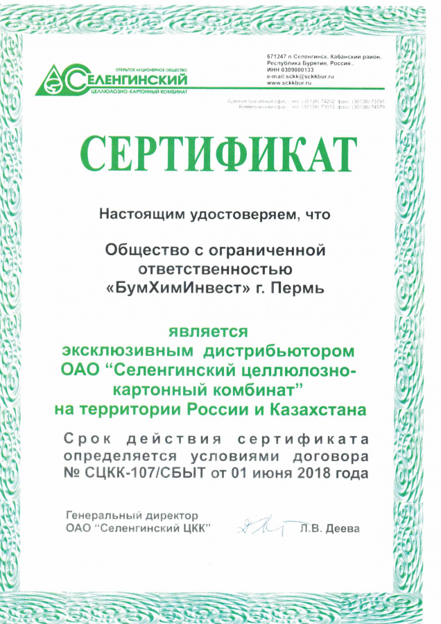 Сертификат дистрибьютора ОАО "Селенгинский ЦБК"