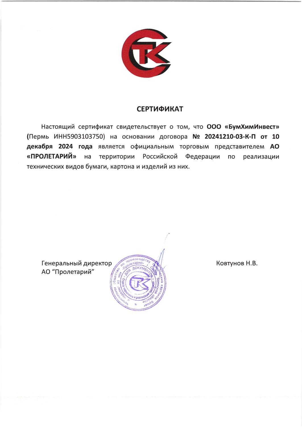 Настоящий сертификат свидетельствует о том, что ООО «БумХимИнвест» является официальным торговым представителем