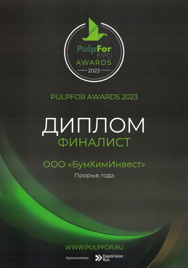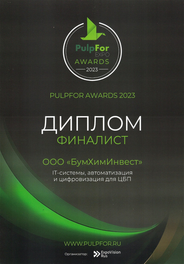 Диплом финалиста PULPFOR AWARDS 2023, IT-системы, автоматизация и цифровизация для ЦБП