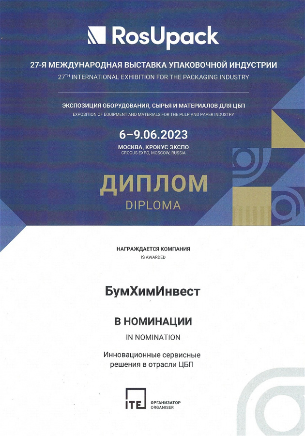 Диплом 27-ой международной выставки упаковочной индустрии RosUpack в номинации "Инновационные сервисные решения в отрасли ЦБП"