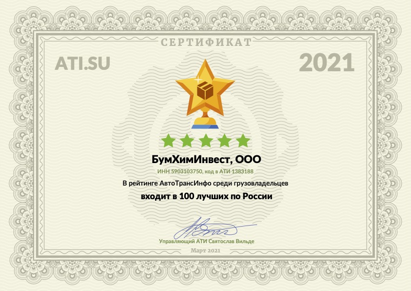 ООО "БумХимИнвест" в рейтинге АвтоТрансИнфо среди грузовладельцев входит в 100 лучших по России